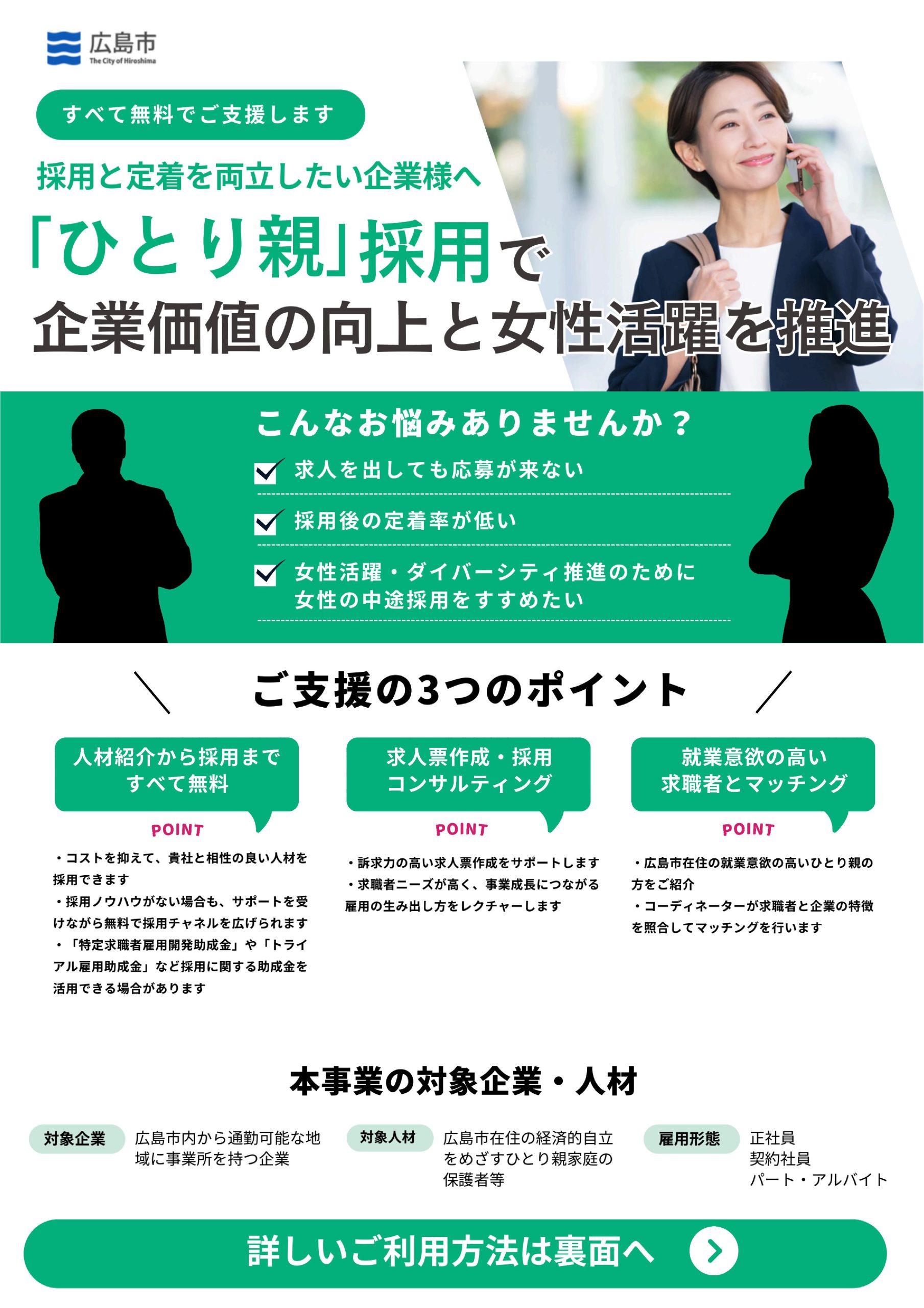 広島市では、市内在住の「働きたいひとり親家庭の保護者」と、人手不足に悩む企業とをつなぐ「ひとり親求人紹介事業」を実施しています。