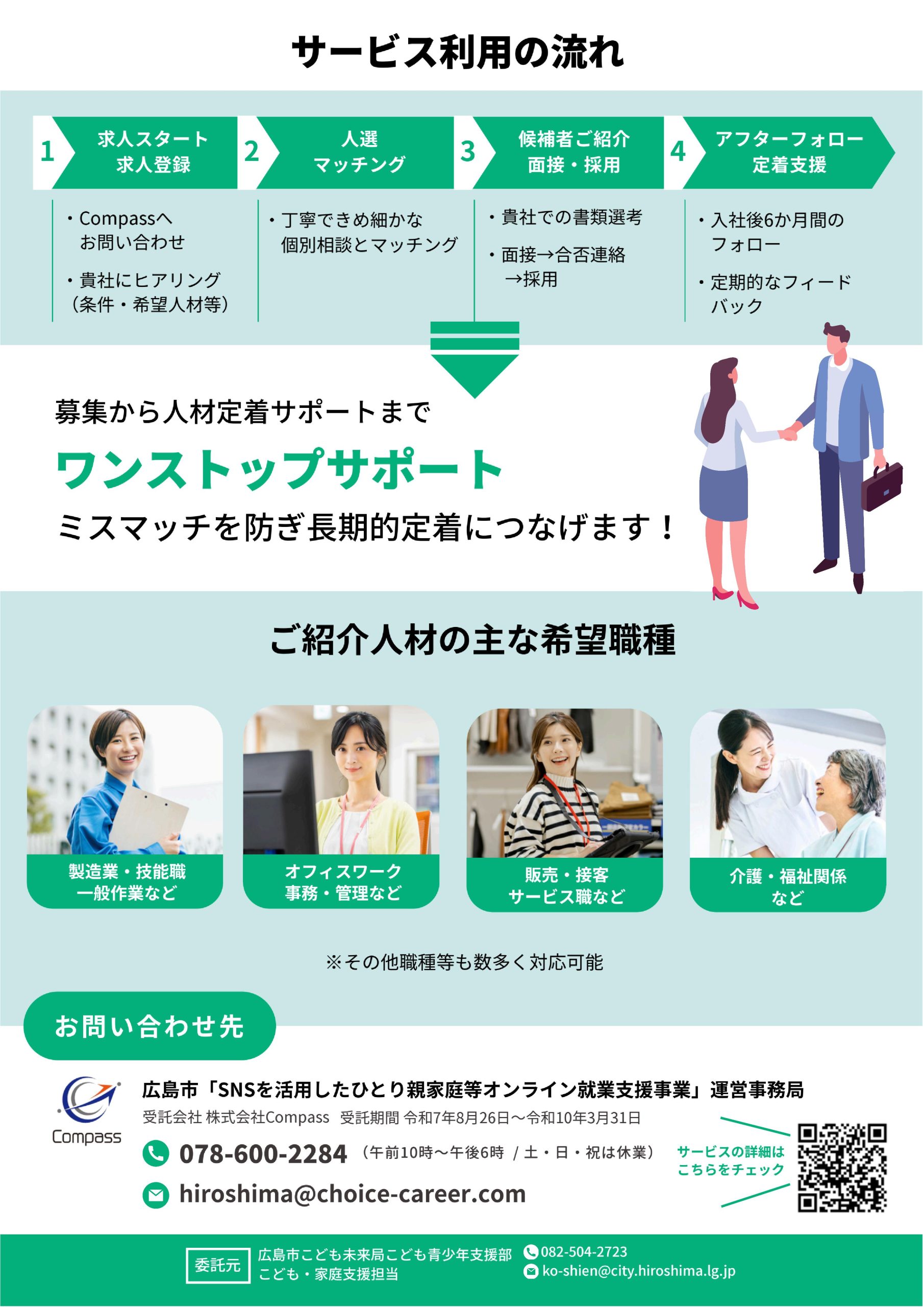 広島市の委託を受けた「株式会社Compass(コンパス)」が、広島市在住の「ひとり親」の方と、広島市内から通勤可能な企業とのマッチングを行います。