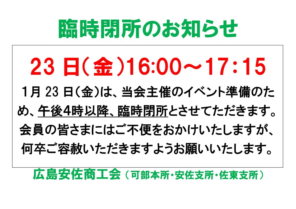 【1月23日(金)】臨時閉所のお知らせ 2026年01月21日 1月23日(金)は、当会主催のイベント準備のため、午後4時以降、臨時閉所とさせていただきます。 会員の皆さまにはご不便をおかけいたしますが、何卒ご理解いただきますようお願いいたします。 広島安佐商工会 (可部本所・安佐支所・佐東支所) 一覧へ